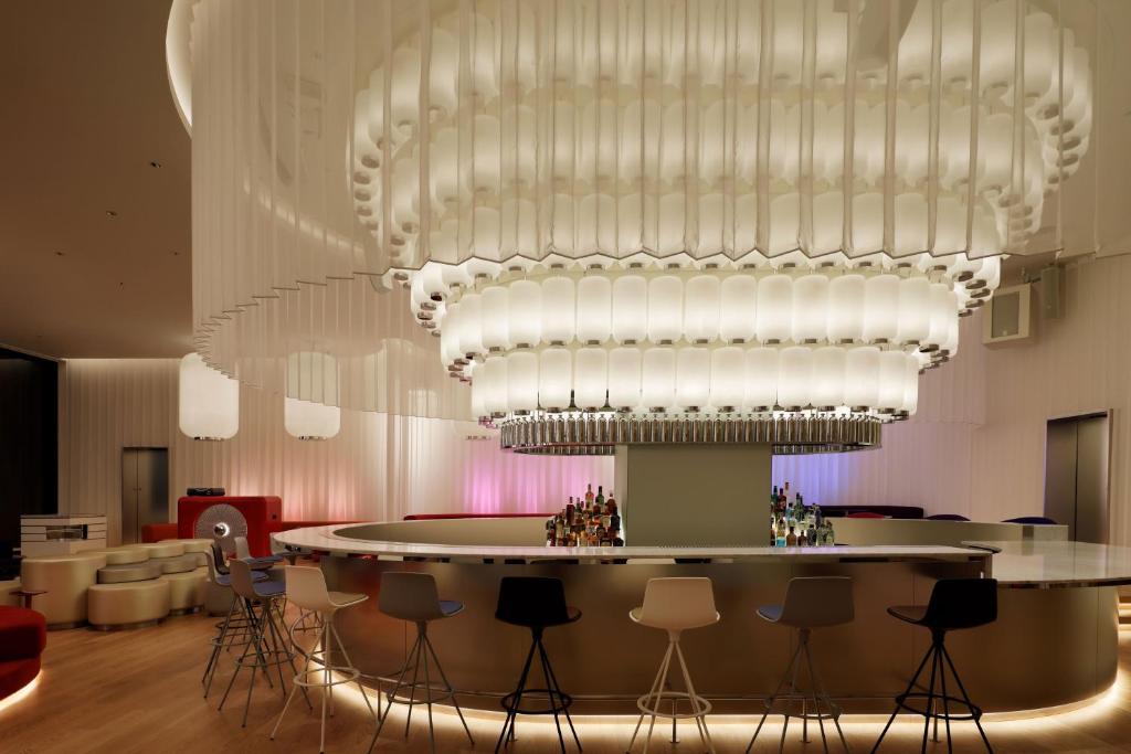 Conrad ligger högt uppe över Osaka och imponerar redan från det ögonblick du kliver in i lobbyn, där glittrande ljus och lyxig design sätter tonen. Hotellet ligger på de översta våningarna i Nakanoshima Festival West Tower, cirka 200 meter upp, och erbjuder vidsträckt utsikt över staden genom fönster från golv till tak – perfekt för drinkar i solnedgången, möten och eleganta evenemang.