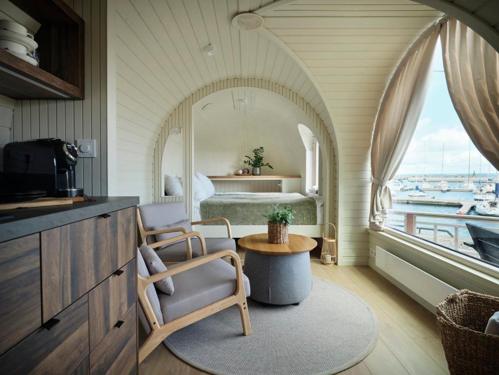 Stugorna är kompakta men mysiga, med stora fönster med utsikt över Tallinnbukten och privata terrasser som är perfekta för lugna morgnar eller drinkar i solnedgången. Med endast nio rum erbjuder Iglupark en intim vistelse utformad för att inspirera till avkoppling och kreativitet.
